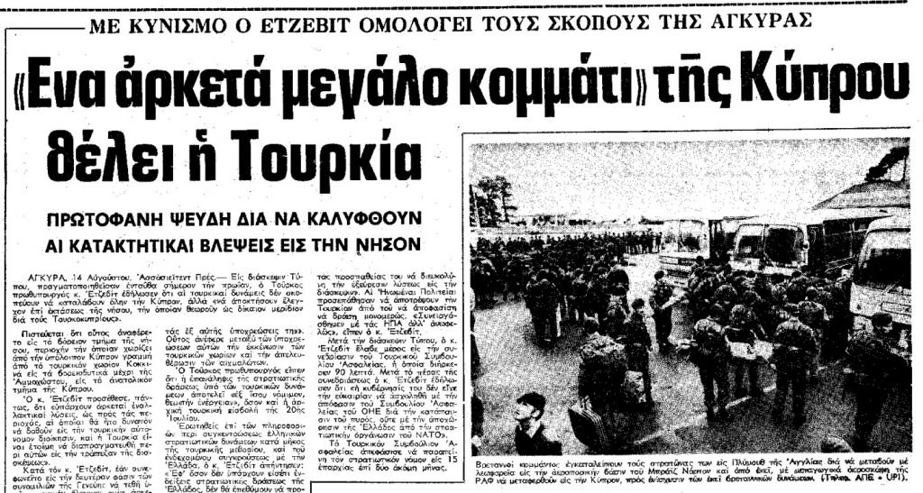 »Εις την περιοχήν αυτήν πιστεύεται ότι ανεφέρετο και ο Τούρκος πρωθυπουργός κ. Ετζεβίτ με την δήλωσίν του ότι “δεν επιδιώκωμεν να θέσωμεν υπό τον έλεγχόν μας μεγαλύτερον τμήμα της Κύπρου από εκείνο το οποίον θεωρούμεν ως δίκαιον μερίδιον των Τουρκοκυπρίων.