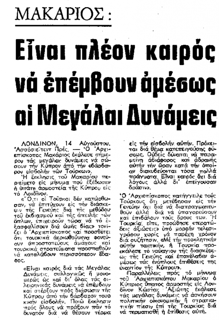 »Η απόφασις της Κυβερνήσεως απετέλεσε και την πρώτην της αντίδρασιν, όταν απεδείχθη χθες ότι η συμμαχία του ΝΑΤΟ ήτο ανίκανος όχι μόνον να διασώση από ναυάγιον την διάσκεψιν της Γενεύης αλλά και να παρεμποδίση την Τουρκίαν από την εξαπόλυσιν νέας βαρβάρου και απροκλήτου επιθέσεως εις την Κύπρον.