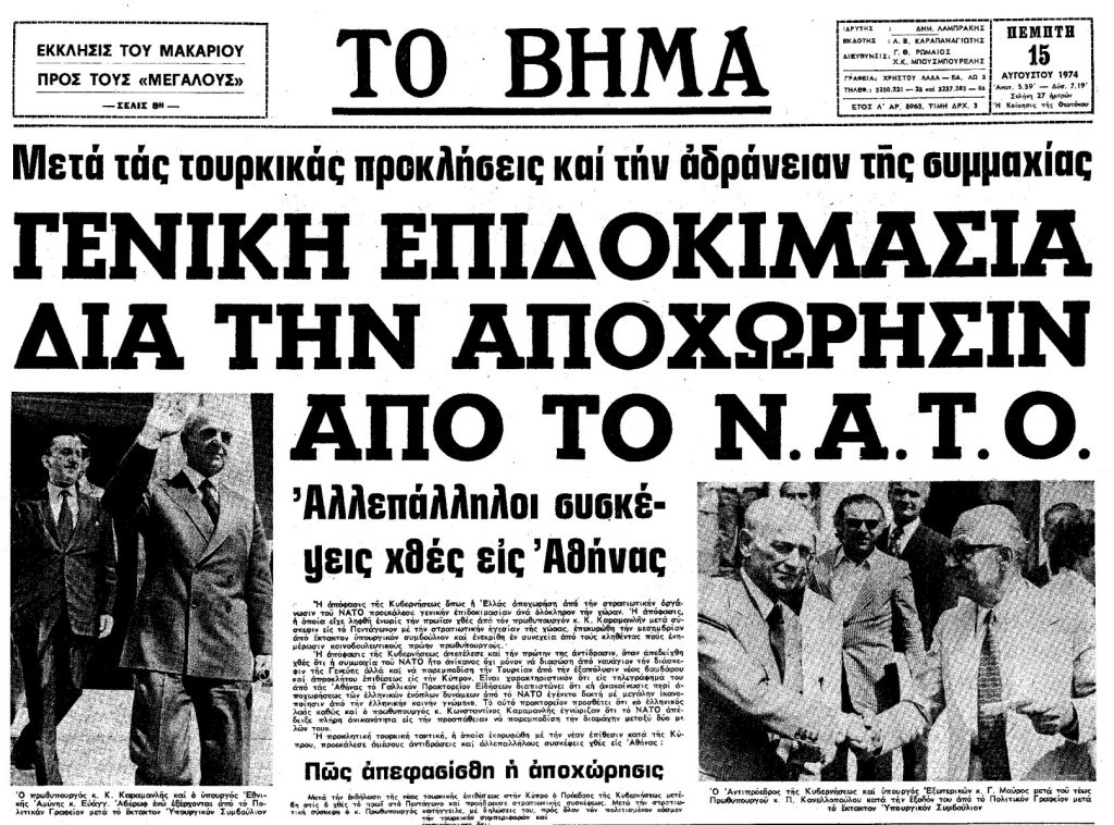 «Η απόφασις της Κυβερνήσεως όπως η Ελλάς αποχωρήση από την στρατιωτικήν οργάνωσιν του ΝΑΤΟ προεκάλεσε γενικήν επιδοκιμασίαν ανά ολόκληρον την χώραν. Η απόφασις, η οποία είχε ληφθή ενωρίς την πρωΐαν χθες από τον πρωθυπουργόν κ. Κ. Καραμανλήν μετά σύσκεψιν εις το Πεντάγωνον με την στρατιωτικήν ηγεσίαν της χώρας, επεκυρώθη την μεσημβρίαν από έκτακτον υπουργικόν συμβούλιον και ενεκρίθη εν συνεχεία από τους κληθέντας προς ενημέρωσιν κοινοβουλετικούς πρώην πρωθυπουργούς.