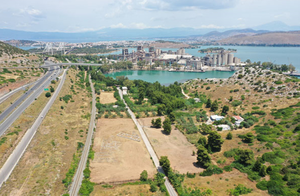 Άποψη της θέσης του αρχαιολογικού χώρους της Αυλιδείας Αρτέμιδας ως προς την πόλη της Χαλκίδας από ψηλά.
