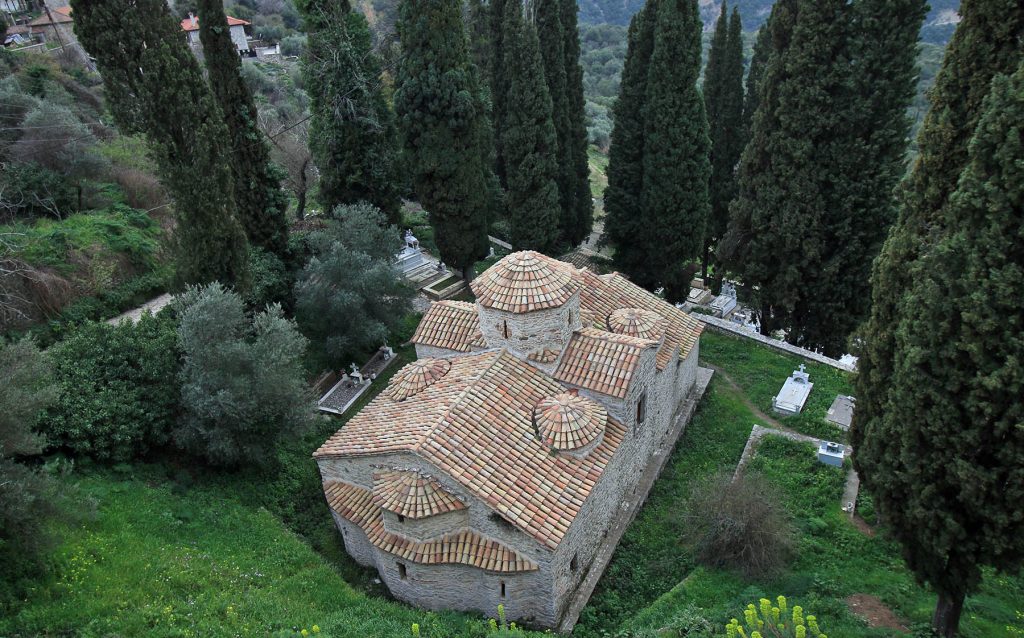 Την Παναγία του Κάστρου, έναν μικρό σταυροειδή εγγεγραμμένο ναό με τρούλο.