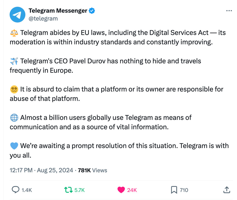 «Το Telegram τηρεί τη νομοθεσία της Ευρωπαϊκής Ένωσης, συμπεριλαμβανομένης της Πράξης για τις Ψηφιακές Υπηρεσίες» και «ο έλεγχος του περιεχομένου συμμορφώνεται προς τους κανόνες» των εταιρειών του κλάδου της, ανέφερε ακόμη η εταιρεία.