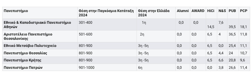 - στην 1η θέση στην Ελλάδα μεταξύ των έξι Πανεπιστημίων που βρίσκονται στο top 1000, και μάλιστα συγκεντρώνοντας τον υψηλότερο βαθμό σε όλα τα επιμέρους κριτήρια στα οποία έλαβαν βαθμό τα Ελληνικά Πανεπιστήμια (Βλέπε Πίνακα 2).