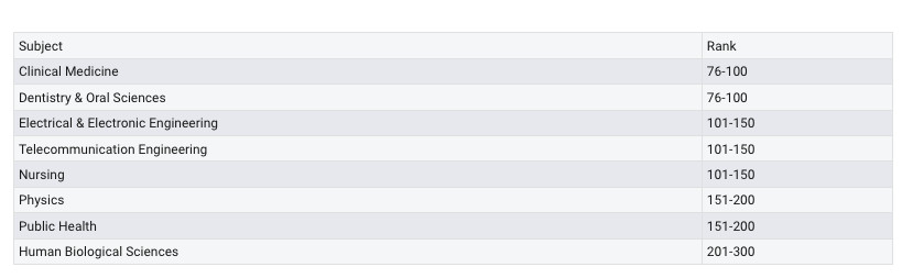 Ειδικότερα, όσον αφορά την κατάταξη με βάση τα Επιστημονικά Αντικείμενα (Academic Subjects), το ΕΚΠΑ βρίσκεται στις θέσεις 76-100 στα πεδία της Κλινικής Ιατρικής, και της Οδοντιατρικής, στις θέσεις 101-150 στα πεδία της Ηλεκτρολογικής και Ηλεκτρονικής Μηχανικής, Μηχανικής Τηλεπικοινωνιών, και της Νοσηλευτικής και στις θέσεις 151-200 στα πεδία της Φυσικής, της Δημόσιας Υγείας, και των Επιστημών της Βιολογίας του Ανθρώπου: