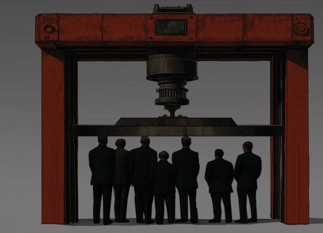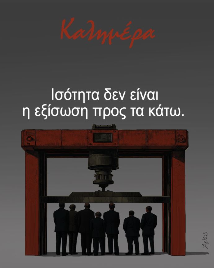 Ο διάσημος καλλιτέχνης σκιτσάρει μία μέγγενη κάτω από την οποία πιέζονται ανθρώπινες φιγούρες. Το σχόλιο που συνoδεύει το σκίτσο είναι ξεκάθαρο αν και δε γίνεται σαφές σε ποιο γεγονός της πρόσφατης επικαιρότητας αναφέρεται. Το σίγουρο είναι ότι μπορεί να παραπέμψει σε πολύ περισσότερες από μία περιπτώσεις που χαρακτηρίζουν τη σύγχρονη ελληνική κοινωνία.