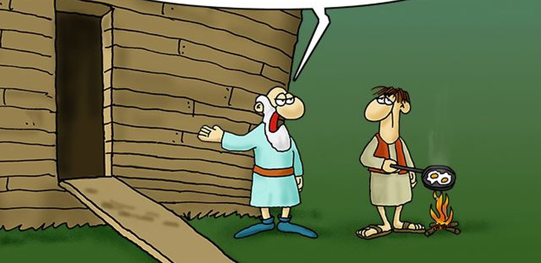 Ο διάσημος σκιτσογράφος εικονογραφεί τον Νώε να κάνει παράπονα σε έναν βοηθό του στον οποίο είχε αναθέσει να επιβιβάσει στην κιβωτό ένα αρσενικό και ένα θηλυκό από κάθε έμβιο είδος.