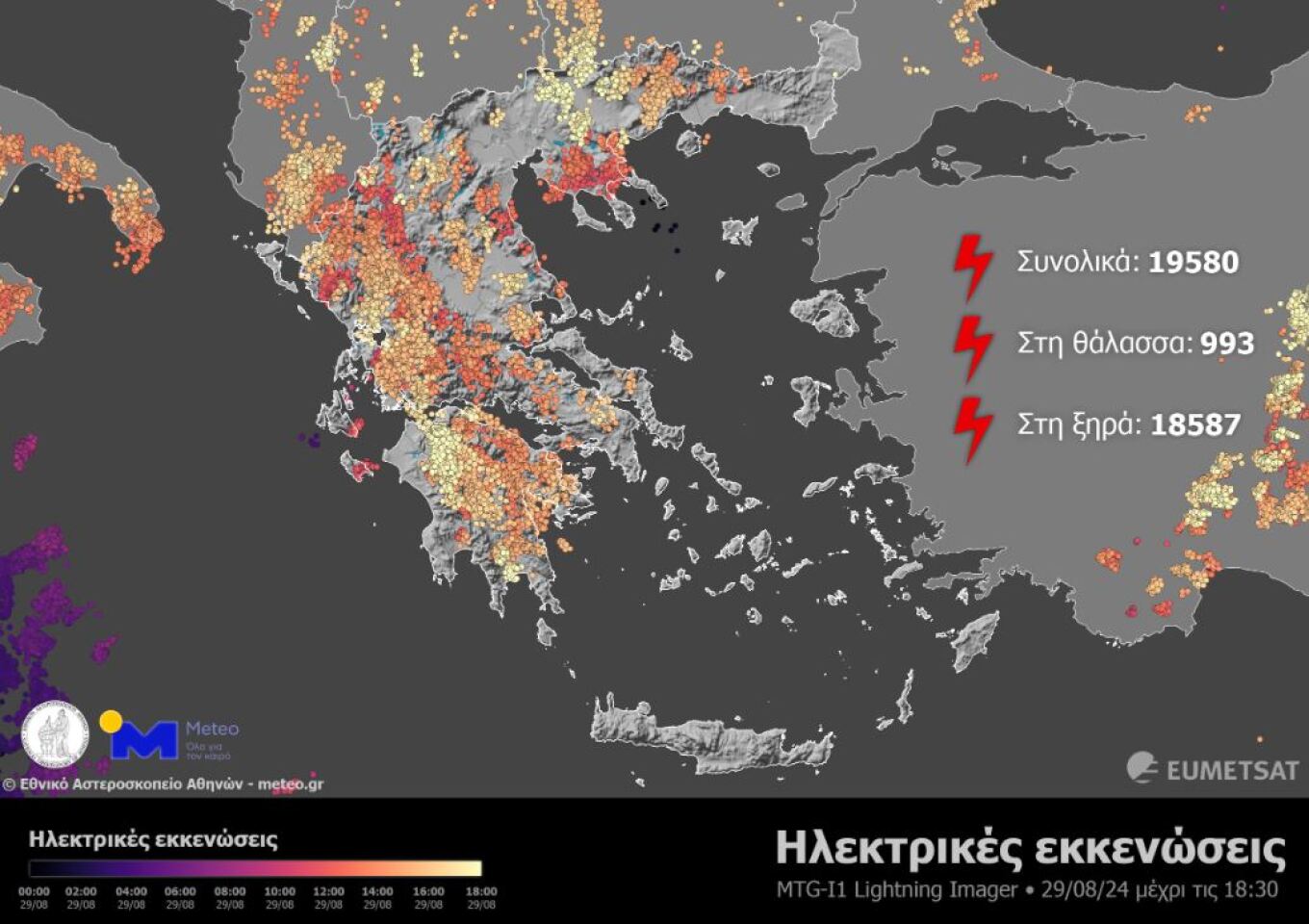 Την ηλεκτρική δραστηριότητα στην ατμόσφαιρα κατέγραψε ο Lightning Imager του δορυφόρου MTG-I1. Στον Χάρτη 2 σημειώνονται οι ηλεκτρικές εκκενώσεις που καταγράφηκαν από την αρχή του εικοσιτετράωρου έως τις 15:30 UTC (18:30 ώρα Ελλάδας). Όπως προκύπτει από αυτή, καταγράφηκαν 19.580 εκκενώσεις, 18.587 εκ των οποίων πάνω από την ξηρά και 933 πάνω από τη θάλασσα.