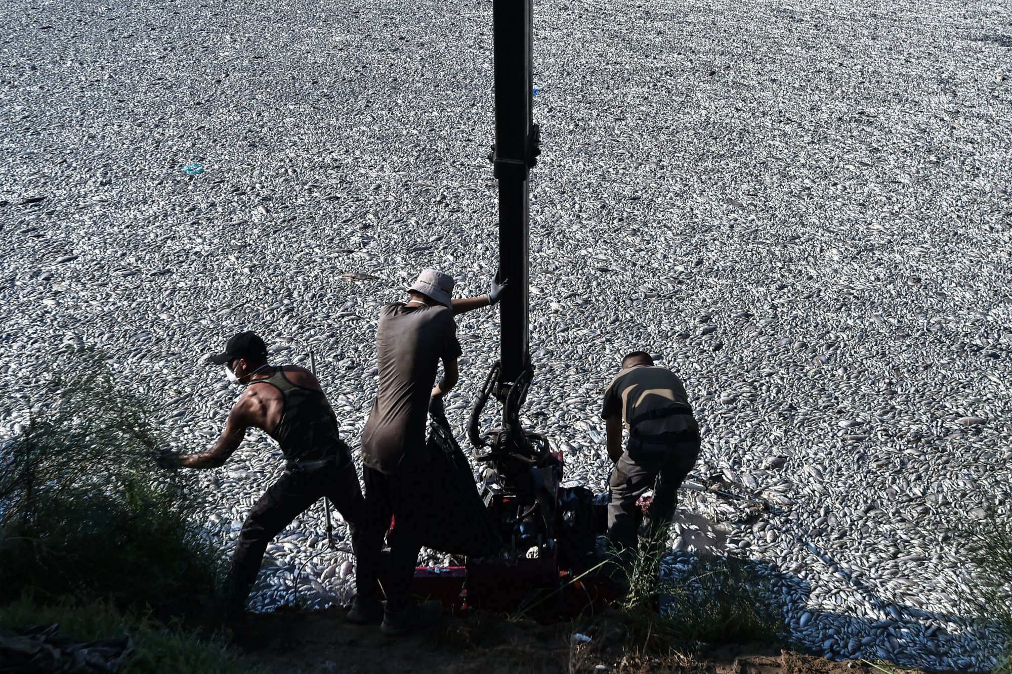 Στον χείμαρρο του Ξηριού, που έχει γεμίσει από τα νεκρά ψάρια, οι εικόνες είναι απόκοσμες. Τα εναέρια πλάνα με drone δείχνουν ότι τα νεκρά ψάρια φθάνουν σε μήκος περίπου 500 μέτρων και το πλέγμα με δυσκολία, που έχει τοποθετηθεί για την προστασία του Παγασητικού, πλέον δεν τα συγκρατεί.