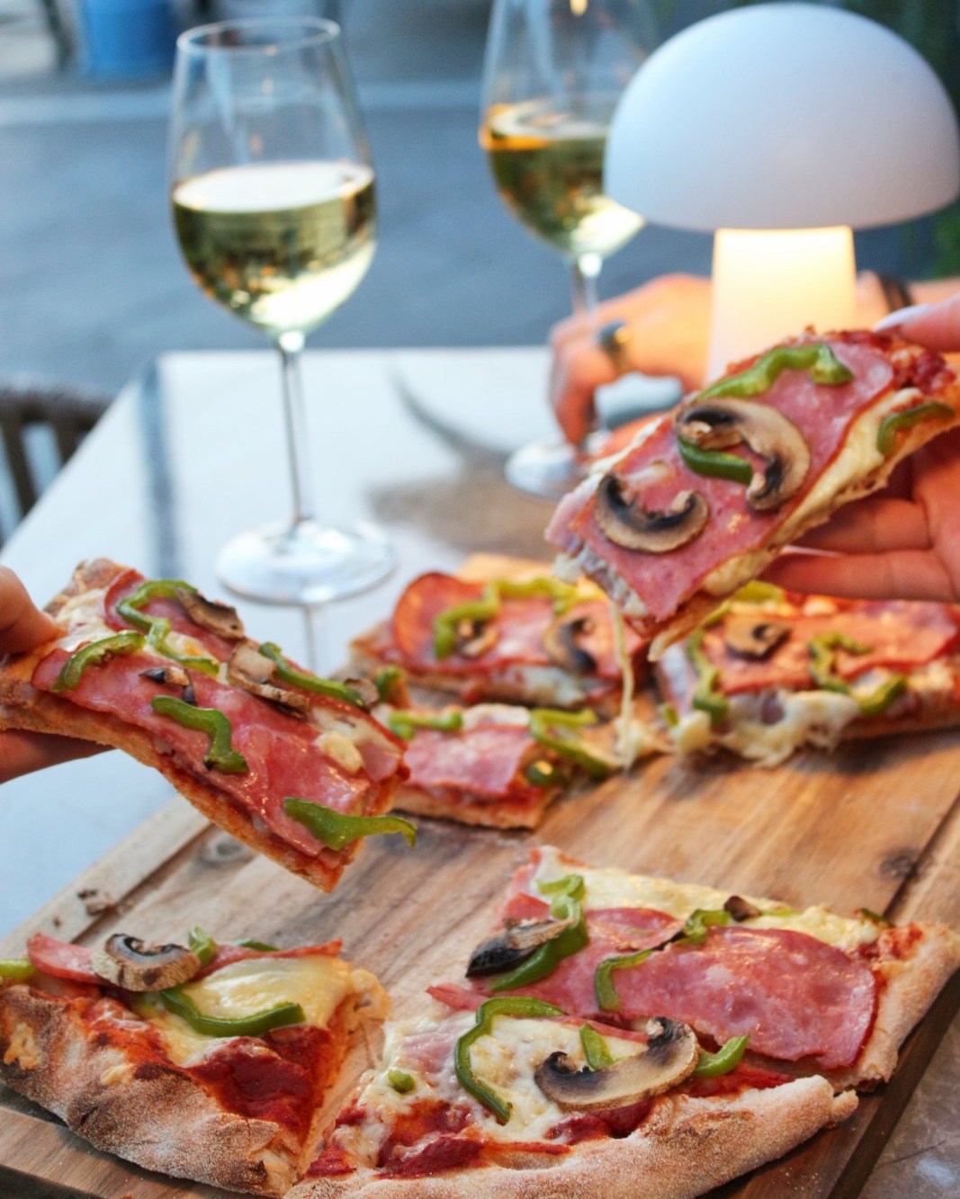 Mια λαχταριστή πίνσα με φρέσκα υλικά, συνοδευόμενη από ένα ποτήρι λευκό κρασί. / Retro coffee & brunch