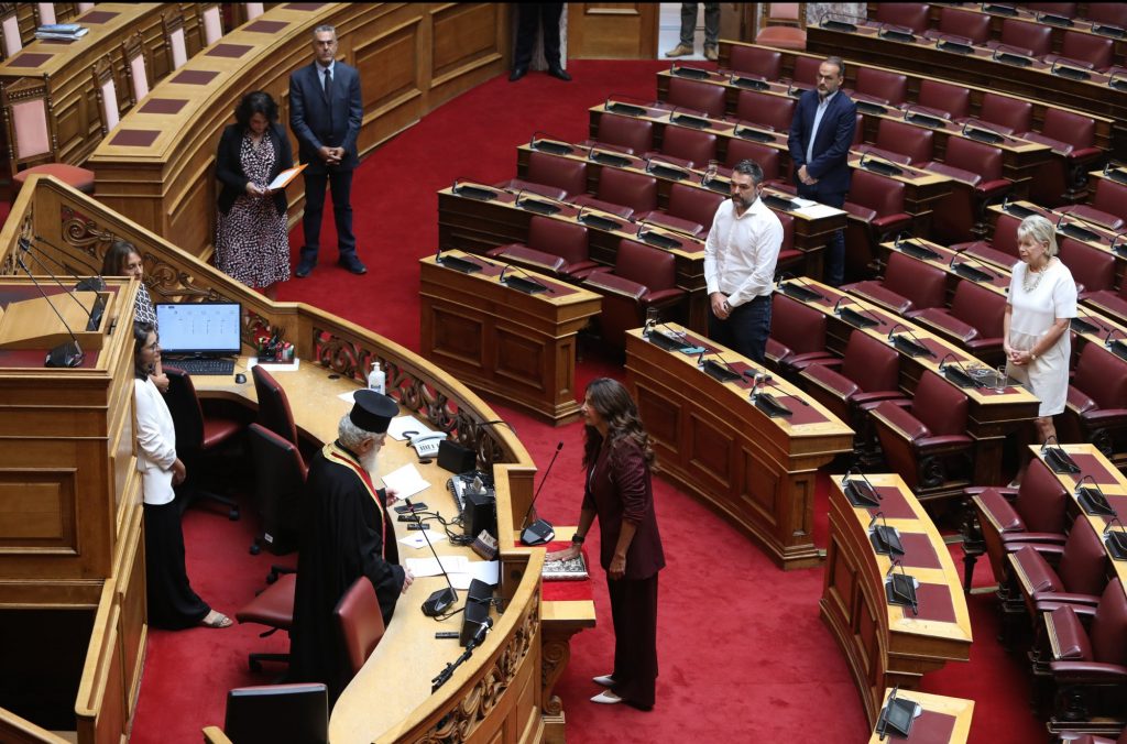 Με θρησκευτικό όρκο επέλεξε να ορκιστεί χθες η Πόπη Τσαπανίδου η οποία κατέλαβε την θέση του παραιτηθέντος βουλευτή Επικρατείας Όθωνα Ηλιόπουλου. Δίπλα της καθόταν στο πρώτο έδρανο ο νέος κοινοβουλευτικός εκπρόσωπος του ΣΥΡΙΖΑ Γιάννης Σαρακιώτης ενώ με θερμό εναγκαλισμό την υποδέχθηκε η έτερη βουλευτής Επικρατείας Έλενα Ακρίτα. Θερμή χειραψία αντάλλαξαν με την κυρία Τσαπανίδου και ο βουλευτής του ΚΚΕ Γιάννης Γκιόκας καθώς και ο «γαλάζιος» Σάββας Αναστασιάδης. Μετά την ορκωμοσία την ενημέρωσε ο νέος πρόεδρος της Κ.Ο. του ΣΥΡΙΖΑ Νίκος Παππάς καθώς και ο διευθυντής της Κ.Ο. Θάνος Μωραίτης. «Είναι ένα άξιο στέλεχος της παράταξης και με την επάρκειά της, την οποία και στο παρελθόν έχει αποδείξει, θα βελτιώσει τις δυνατότητές μας να παρεμβαίνουμε στη Βουλή και να επικοινωνούμε τις θέσεις του ΣΥΡΙΖΑ, για πολλά θέματα, προς την κοινωνία», δήλωσε ο κ. Παππάς ενώ η ίδια τόνισε πως «είμαι αποφασισμένη να δώσω τον καλύτερο εαυτό μου και να εργαστώ κι εγώ με όλες μου τις δυνάμεις υπηρετώντας τα συμφέροντα του ελληνικού λαού».