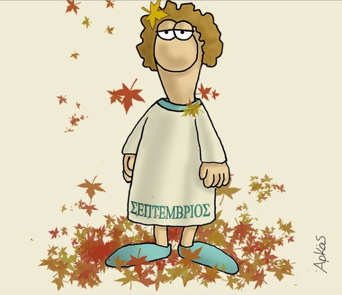 Ο διάσημος καλλιτέχνης μας απευθύνει την κυριακάτικη καλημέρα του σκιτσάροντας τον μήνα Σεπτέμβριο που μόλις ήρθε, ντυμένος στα χρώματα του φθινοπώρου – που καιρικά είναι αμφίβολο αν θα το βιώσουμε – πατώντας πάνω στα πεσμένα φύλλα των δέντρων.