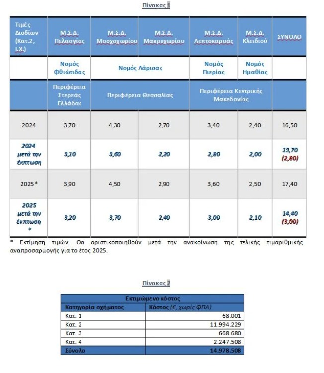 - 2,8 ευρώ για το 2024, καθώς η επιβάρυνση της διέλευσης από τους πέντε σταθμούς μειώνεται από 16,5 (σήμερα) σε 13,7 ευρώ, και
