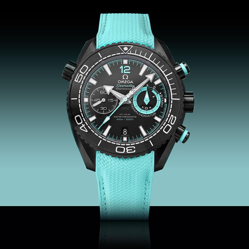 Στεγανό μέχρι 200 μέτρα βάθος, το Seamaster Planet Ocean της Omega συνδυάζει το βαθύ μαύρο χρώμα με το τιρκουάζ του λογότυπου της ομάδας Emirates New Zealand. Τη μαύρη κεραμική κάσα σε διάμετρο 45,5 mm συμπληρώνει μια στεφάνη μονής κατεύθυνσης από βουρτσισμένο μαύρο κεραμικό με καταδυτική κλίμακα από λευκό σμάλτο και κουκκίδα σε τρίγωνο πλαίσιο στη θέση ώρας 12, η οποία περιλαμβάνει λευκό υλικό Super-LumiNova ώστε να εκπέμπει πράσινο φως στο σκοτάδι.