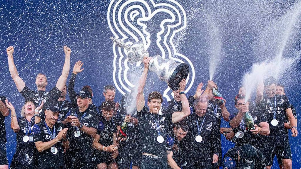 Η ομάδα Emirates New Zealand στο βάθρο του νικητή στο προηγούμενο America’s Cup. Έχει τον ρόλο του Defender στη φετινή διοργάνωση και θα προσπαθήσει να υπερασπιστεί τον τίτλο της.