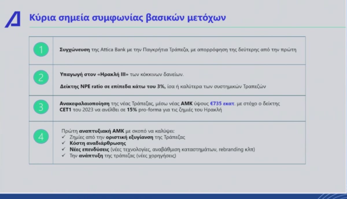 Μετά από μια πολύπαθη πορεία, όπως είπε η διευθύνουσα σύμβουλος της Attica Bank Ελένη Βρεττού που χαρακτηρίστηκε μεταξύ άλλων από αδύναμους ισολογισμούς, οι μέτοχοι αποφασίζουν σήμα να αφήσουν όλα αυτά πίσω τους, ενώ παράλληλα σηματοδοτεί το όραμα για μια ανταγωνιστική τράπεζα, διπλάσια σε μέγεθος και υψηλή απόδοση κεφαλαίων.
