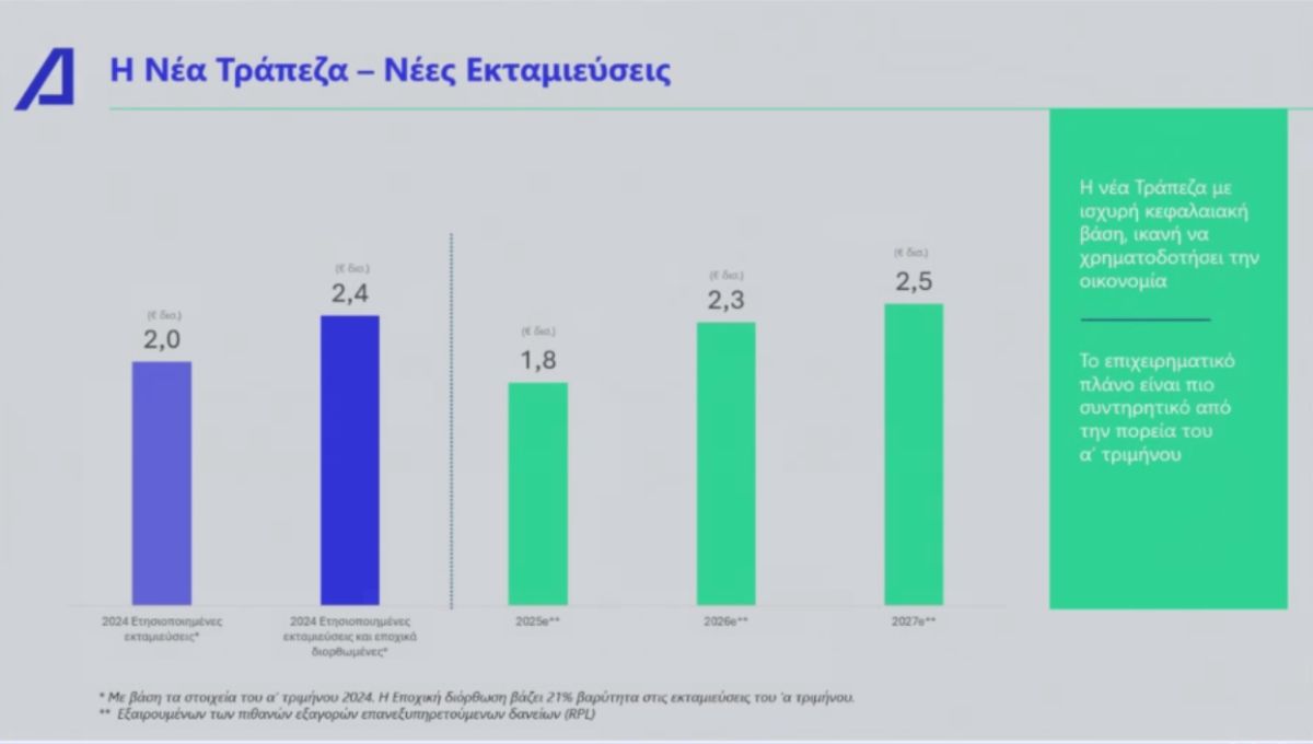 Αναφορικά με την επικείμενη αύξηση μετοχικού κεφαλαίου ύψους 735 εκατ. ευρώ, η κ. Βρεττού σημείωσε πως επιδίωξη είναι να λάβει χώρα τον Οκτώβριο ενώ τόνισε πως θα συμβάλει και στην αναπτυξιακή προοπτική της, ώστε το 2027 το χαρτοφυλάκιο των δανείων της τράπεζας να ανέλθει στα 6 δισ. ευρώ και οι νέες εκταμιεύσεις να κινηθούν στο επίπεδο των 2 δισ. ευρώ ετησίως.