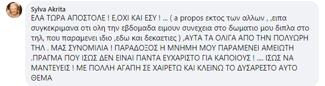 «ΕΛΑ ΤΩΡΑ ΑΠΟΣΤΟΛΕ! Ε,ΟΧΙ ΚΑΙ ΕΣΥ ! … (a propos εκτος των αλλων, ειπα συγκεκριμένα οτι όλη την εβδομαδα ήμουν συνεχεια στο δωματιο μου διπλα στο τηλ, που παραμενει ίδιο, εδω και δεκαετιες). Αυτά τα ολίγα από την πολύωρη τηλεφωνική μας συνομιλία! Παραδόξως η μνήμη μου παραμένει αμείωτη, πράγμα που ίσως δεν είναι πάντα ευχάριστο για κάποιους! ίσως να μαντεύεις. Με πολλή αγάπη σε χαιρετώ και κλείνω το δυσάρεστο αυτό θέμα.»