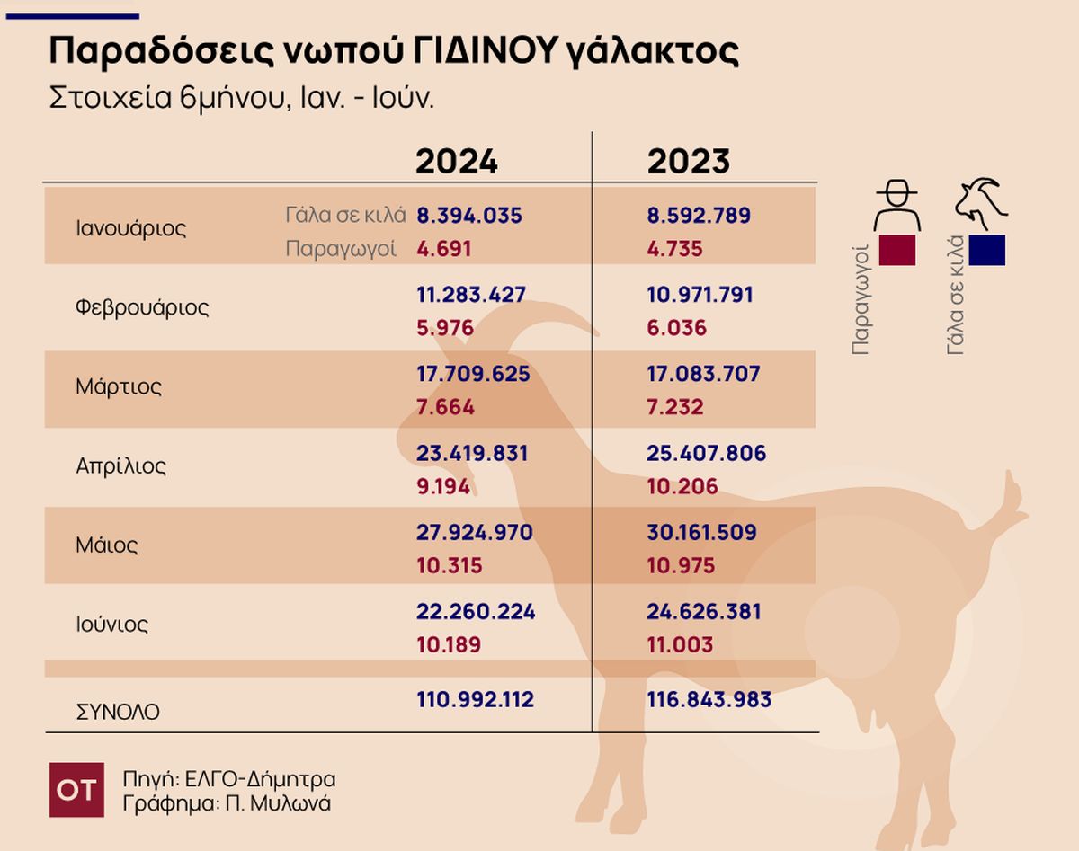 Αντίστοιχα, οι ποσότητες γίδινου γάλακτος έφτασαν τα110.992.112 κιλά φέτος από 116.843.983 κιλά.