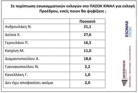 Προβάδισμα 6,5 μονάδων στον Χάρη Δούκα δίνει δημοσκόπηση της εταιρείας Interview που διενεργήθηκε για λογαριασμό της «Political», ένα μήνα πριν τις εσωκομματικές εκλογές στο ΠαΣοΚ.