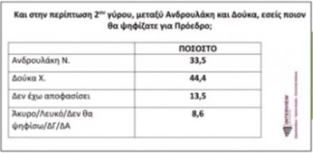 Η δημοσκόπηση καταγράφει και τα αποτελέσματα του δεύτερου γύρου εξετάζοντας τρία σενάρια. Το σενάριο Ανδρουλάκη – Δούκα, Ανδρουλάκη – Γερουλάνου και Ανδρουλάκη – Διαμαντοπούλου.