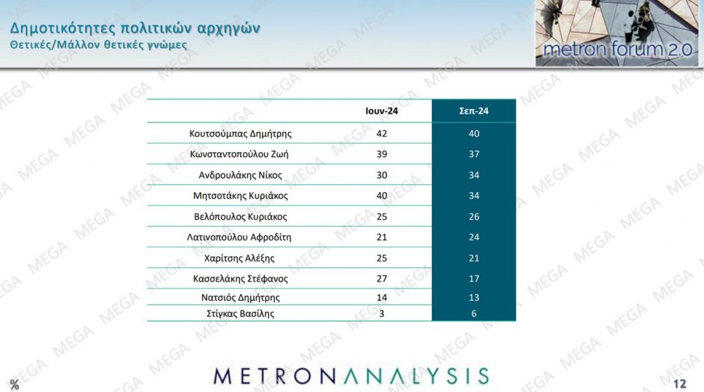 Όσον αφορά τη δημοτικότητα των πολιτικών αρχηγών, ο Δημήτρης Κουτσούμπας βρίσκεται στην κορυφή, ακολουθούμενος από τη Ζωή Κωνσταντοπούλου και τον Νίκο Ανδρουλάκη.