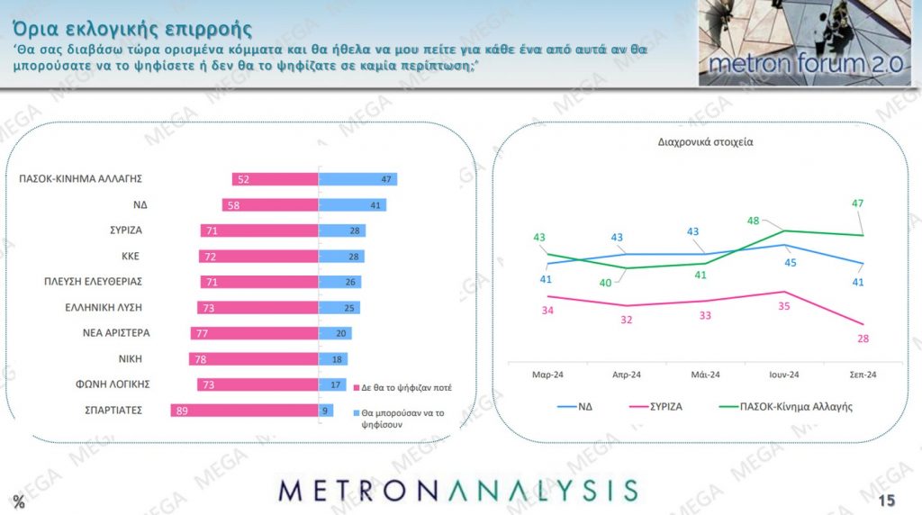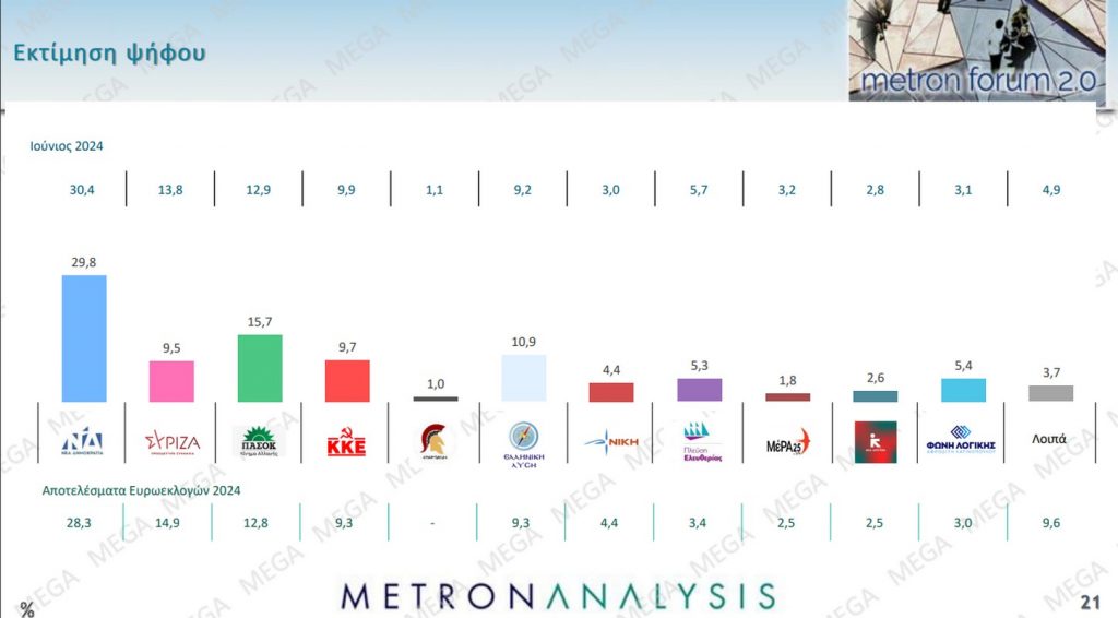Σταθερά στην πρώτη θέση παραμένει η Νέα Δημοκρατία, αν και σημειώνει οριακές απώλειες, την ώρα που το ΠαΣοΚ αυξάνει τα ποσοστά του και βρίσκεται πλέον με διαφορά στη δεύτερη θέση, καταγράφοντας μάλιστα ποσοστό 15,7% στην εκτίμηση ψήφου, σε νέα δημοσκόπηση της εταιρείας Metron Analysis για λογαριασμό του MEGA.