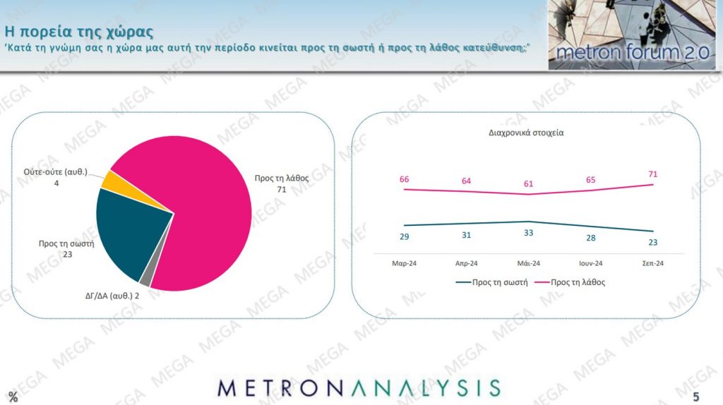 Την ίδια ώρα, η συντριπτική πλειοψηφία των πολιτών θεωρεί ότι η χώρα πηγαίνει προς τη λάθος κατεύθυνση, καθώς αυτήν την απάντηση δίνει το 71% των ερωτηθέντων της δημοσκόπησης. «Προς τη σωστή» απαντά το 23% των πολιτών.