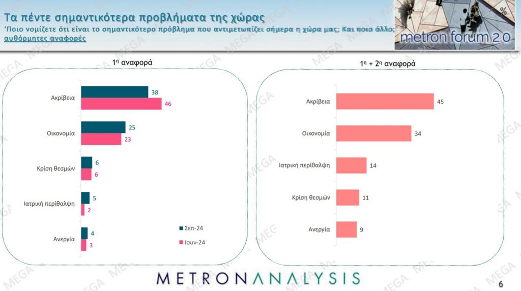 Η ακρίβεια είναι σταθερά το σημαντικότερο πρόβλημα της καθημερινότητας των Ελλήνων, καθώς βρίσκεται στην κορυφή με 46%, ενώ ακολουθεί η οικονομία με 23% και η κρίση θεσμών με 6%.