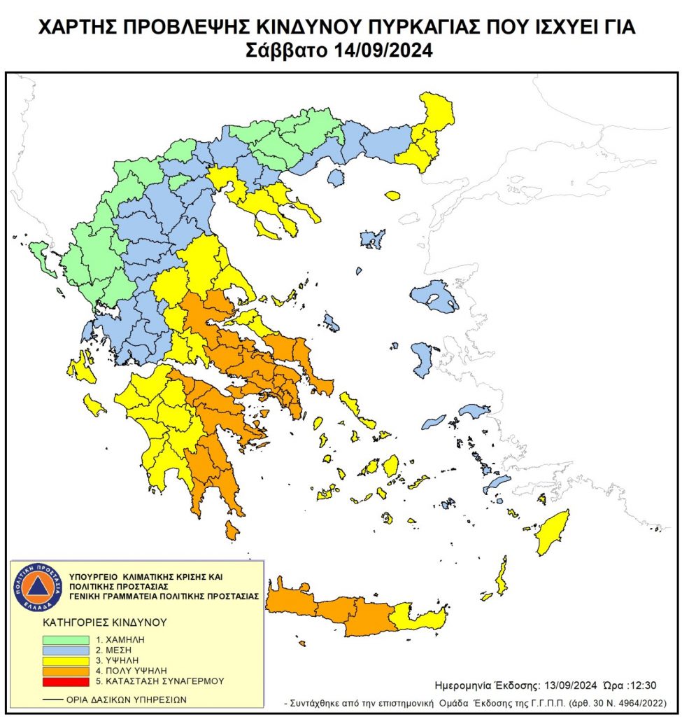 Πολύ υψηλός κίνδυνος πυρκαγιάς (κατηγορία κινδύνου 4) προβλέπεται αύριο για την περιφέρεια Αττικής καθώς και για περιοχές των περιφερειών Πελοποννήσου, Δυτικής Ελλάδας, Στερεάς Ελλάδας, Θεσσαλίας και Κρήτης.