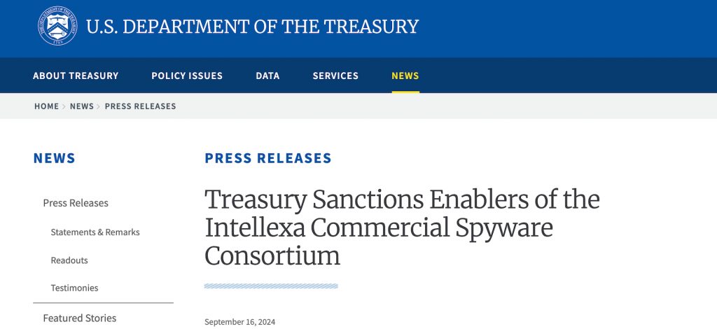Το Γραφείο Ελέγχου Ξένων Περιουσιακών Στοιχείων (OFAC) του υπουργείου Οικονομικών των ΗΠΑ προχωρά, όπως ανακοινώθηκε επισήμως σήμερα, στην επιβολή κυρώσεων κατά πέντε ατόμων και μίας οντότητας που σχετίζονται με την Κοινοπραξία Intellexa (Intellexa Consortium).