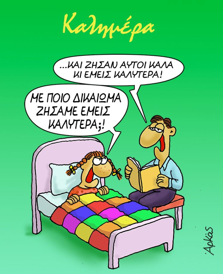 Με ένα ακόμη αιχμηρό σκίτσο μάς καλημερίζει ο Αρκάς το οποίο – παρά τη φαινομενική του “απαλότητα” είναι βέβαιο ότι και πάλι θα βάλει σε αντιπαράθεση τους υποστηρικτές και τους πολέμιους του γνωστού σκιτσογράφου, αναφορικά με το ζήτημα των δικαιωμάτων και την υπεράσπισή τους.