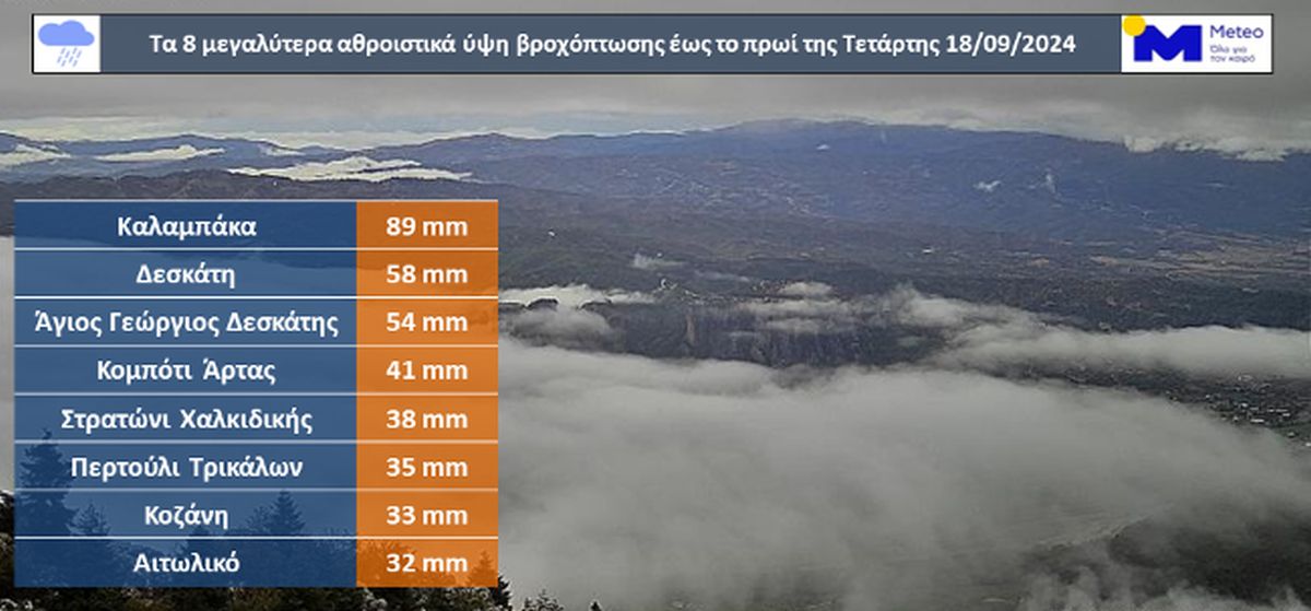 Σύμφωνα με το δίκτυο τα οκτώ μεγαλύτερα ύψη βροχόπτωσης έως τις πρωινές ώρες της Τετάρτης 18/09, παρουσιάζονται στον ενσωματωμένο πίνακα της παρακάτω εικόνας.