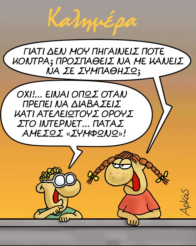 – Οχι!.. Είναι όπως όταν πρέπει να διαβάσει κάτι ατέλειωτους όρους στο ίντερντ… Πατάς αμέσως «συμφωνώ»!