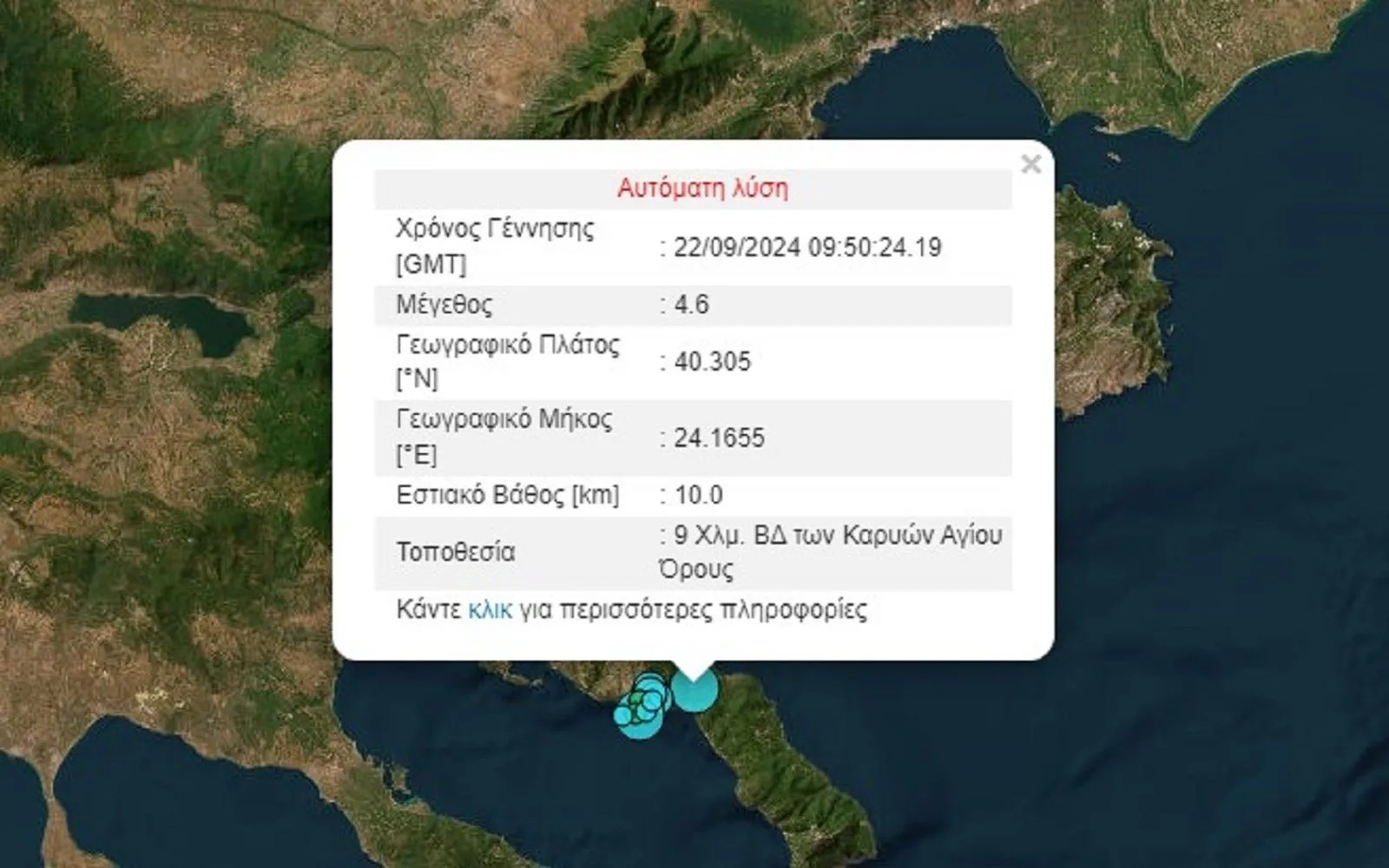 Ισχυρή σεισμική δόνηση μεγέθους 4,6 βαθμών της κλίμακας Ρίχτερ σημειώθηκε το μεσημέρι της Κυριακής με επίκεντρο το Άγιον Όρος.