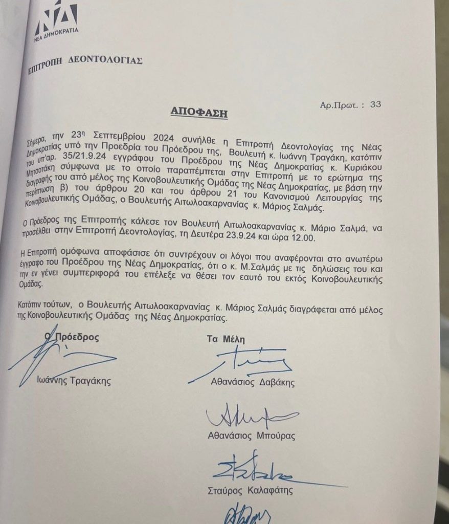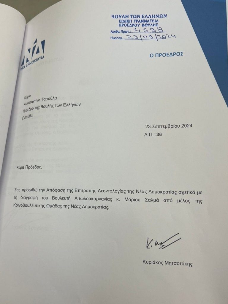 Και επισήμως εκτός της ΚΟ της Νέας Δημοκρατίας είναι ο Μάριος Σαλμάς, με επιστολή του Κυριάκου Μητσοτάκη προς τον πρόεδρο της Βουλής, Κωνσταντίνο Τασούλα.