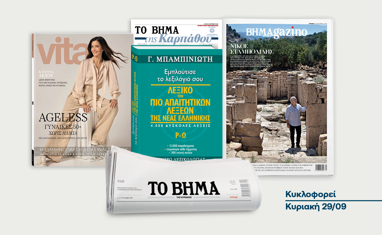 Στις 29 Σεπτεμβρίου το «Βήμα της Κυριακής» κυκλοφορεί με συναρπαστικές προσφορές μεταξύ των οποίων ο τέταρτος τόμος του Λεξικού των πιο Απαιτητικών Λέξεων της Νέας Ελληνικής, το περιοδικό VITA, η μαθητική εφημερίδα της Καρπάθου και όπως κάθε Κυριακή, ΒΗΜΑgazino.