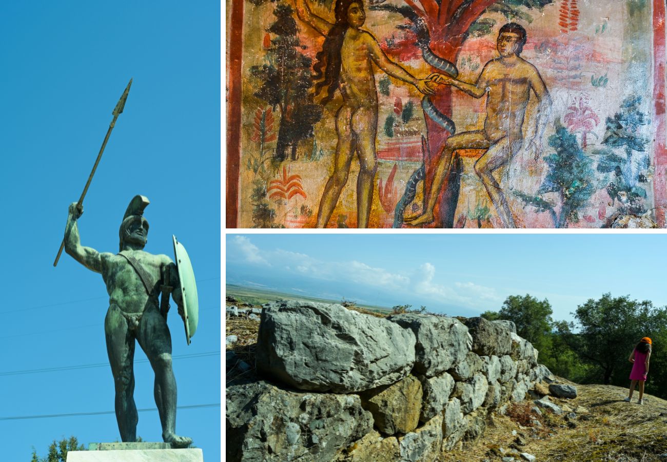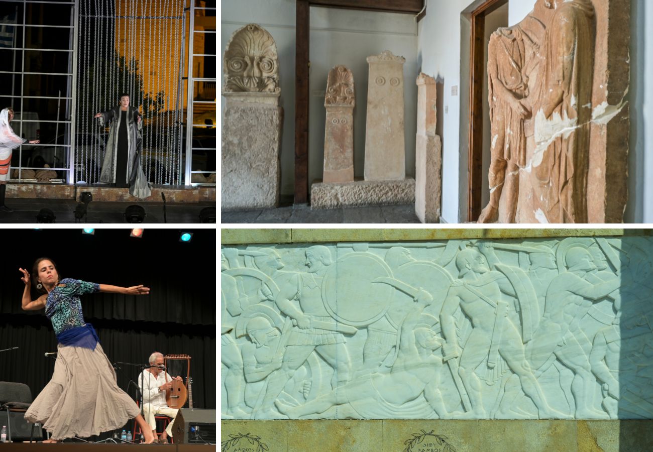 Aπό πάνω αριστερά: Ικέτιδες του Αισχύλου, Κέντρο Ιστορικής Ενημέρωσης Θερμοπυλών, συναυλία παραδοσιακών τραγουδιών με performance.