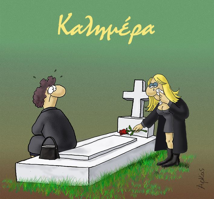 Ο καλλιτέχνης στο σημερινό του σκίτσο απεικονίζει ένα μνήμα στο οποίο έχει πάει η μαυροφορεμένη σύζυγος που πενθεί τον άντρα της. Και ενώ κάθεται στα μάρμαρα του τάφου, πίσω της αντιλαμβάνεται μια παρουσία. Στρέφει το βλέμμα πίσω από την πλάτη της και έρχεται αντιμέτωπη με μια, μετά θάνατον του συζύγου της, αποκάλυψη.