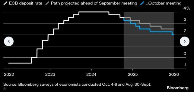 Με τον πληθωρισμό να βρίσκεται πλέον κάτω από τον στόχο του 2%, οι αναλυτές βλέπουν την ΕΚΤ να μειώνει το επιτόκιο καταθέσεων κατά 25 μονάδες βάσης και κατά το ίδιο ποσοστό σε κάθε συνεδρίαση μέχρι τον Μάρτιο. Από εκεί και έπειτα, οι επενδυτές περιμένουν δύο ακόμη μειώσεις και συγκεκριμένα τον Ιούνιο και τον Δεκέμβριο, με τελικό προορισμό του επιτοκίου στο 2%.
