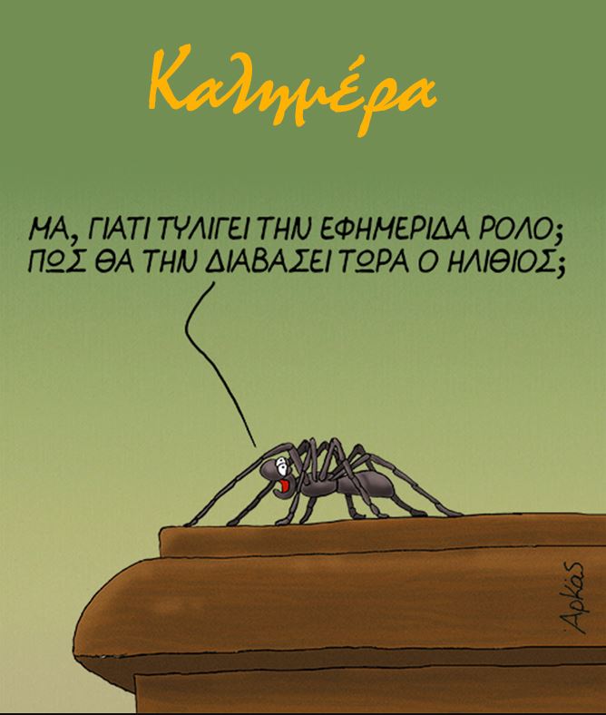 Ο διάσημος σκιτσογράφος μάς απευθύνει την καθιερωμένη «Καλημέρα» του με μία αράχνη η οποία στέκει πάνω σε ένα έπιπλο και αν και δεν το βλέπουμε αντιλαμβανόμαστε – από αυτά που εκείνη λέει – ότι κάποιος, απέναντί της, έχει κάνει ρολό μία εφημερίδα και ετοιμάζεται να τη σκοτώσει.