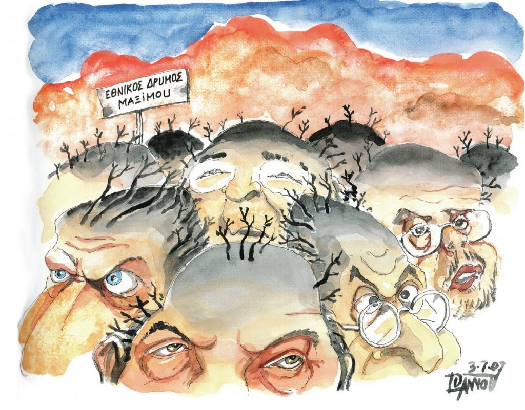 Γ.Α.: Είναι μια εξαιρετικά δύσκολη δουλειά, λόγω της σχεδόν ανύπαρκτης βάσης δεδομένων όσον αφορά την ιστορία δύο αιώνων ελληνικής πολιτικής γελοιογραφίας. Βυθιστήκαμε επί σχεδόν δώδεκα μήνες σε ψηφιοποιημένες εφημερίδες στη Βιβλιοθήκη της Βουλής, σε ιδιωτικά αρχεία ζώντων ή αποθανόντων συναδέλφων -με την ευγενική άδεια των κληρονόμων τους-, και έπρεπε να καταλήξουμε σε μια επιλογή 400 περίπου σκίτσων μέσα από ένα σύνολο πολλών χιλιάδων. Μας βοήθησε και τους δύο επιμελητές η πολυετής τριβή με την ιστορία της γελοιογραφίας, του Τύπου, της πολιτικής -της ιστορίας γενικότερα. Και μια πολύ βαθιά μνήμη προσώπων, συμβάντων και καταστάσεων, που μας επέτρεψε να συγκροτήσουμε μια αφήγηση των 50 χρόνων εστιάζοντας την έρευνά μας στα μεγάλα γεγονότα και αναζητώντας τις γελοιογραφίες εκείνες (αποκλειστικά από εφημερίδες πανελλαδικής εμβέλειας) που περιέγραφαν πιο εύστοχα και πιο εύληπτα τα γεγονότα εκείνα.