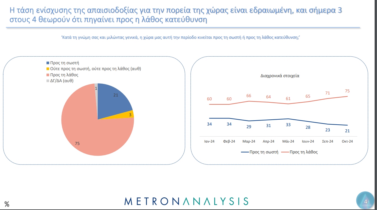 Το δείγμα αφορούσε 1.007 ερωτηθέντες άνω των 17 ετών και το 75% αυτών εξέφρασε την άποψη πως η χώρα ολισθαίνει προς λανθασμένη κατεύθυνση.