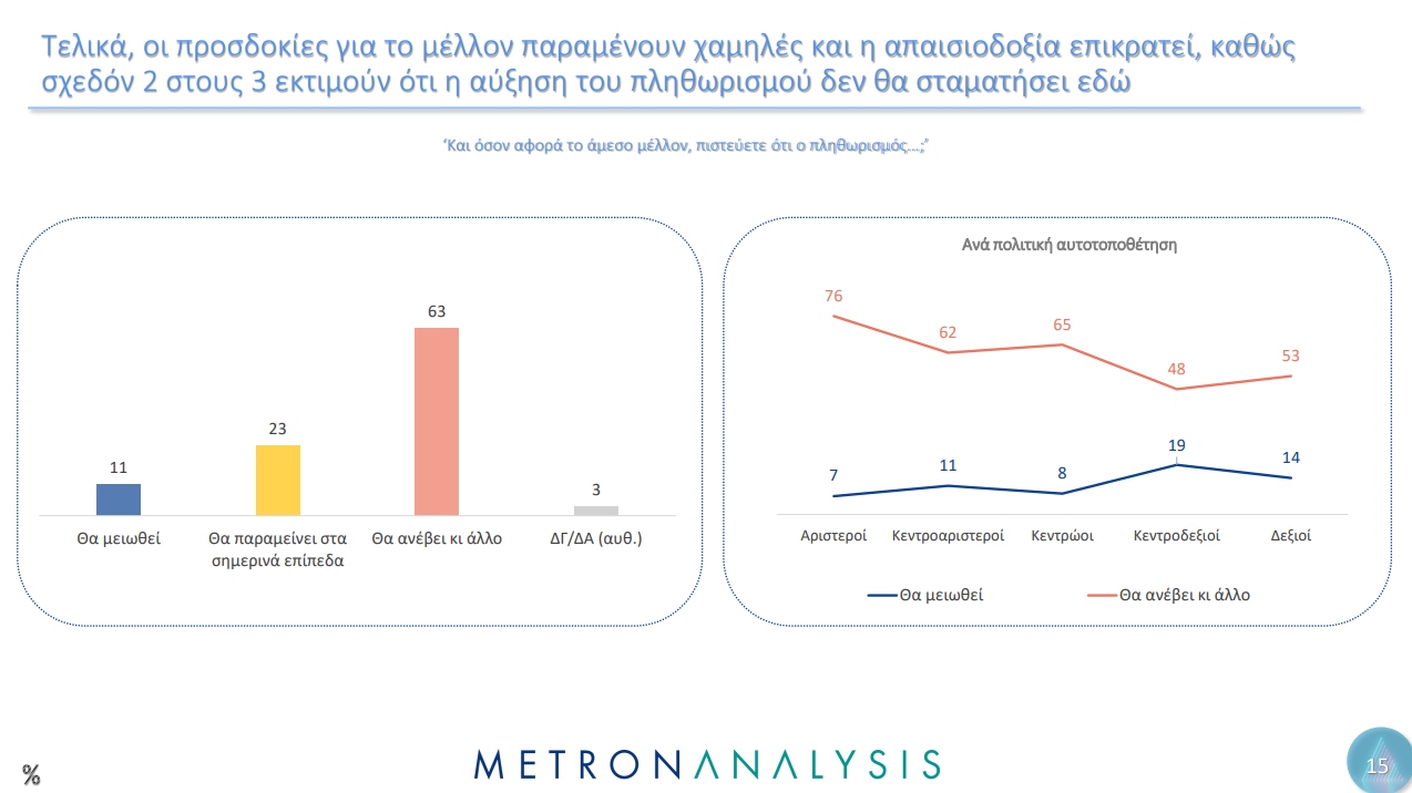 Πάντως το 63% αποκρίθηκε ότι δεν θα αντιμετωπιστεί το πρόβλημα και κατ’ επέκταση πως ο πληθωρισμός θα συνεχίσει την ανοδική πορεία του. Από τους υπόλοιπους το 23% θεωρεί πως η κατάσταση θα παραμείνει αναλλοίωτη, την ώρα που μόλις το 11% εμφανίζεται αισιόδοξο για μείωση τιμών.