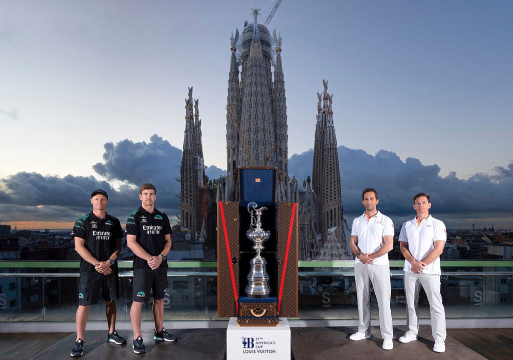 Από αριστερά, οι Nathan Outteridge και Peter Burling (κυβερνήτης) της ομάδας Emirates New Zealand και Sir Ben Ainslie (κυβερνήτης) και Dylan Fletcher της Ineos Britannia ποζάρουν μαζί με το περίφημο τρόπαιο Auld Mug του America’s Cup, με φόντο τον ιστορικό ναό Σαγράδα Φαμίλια της Βαρκελώνης. (photo: America’s Cup)