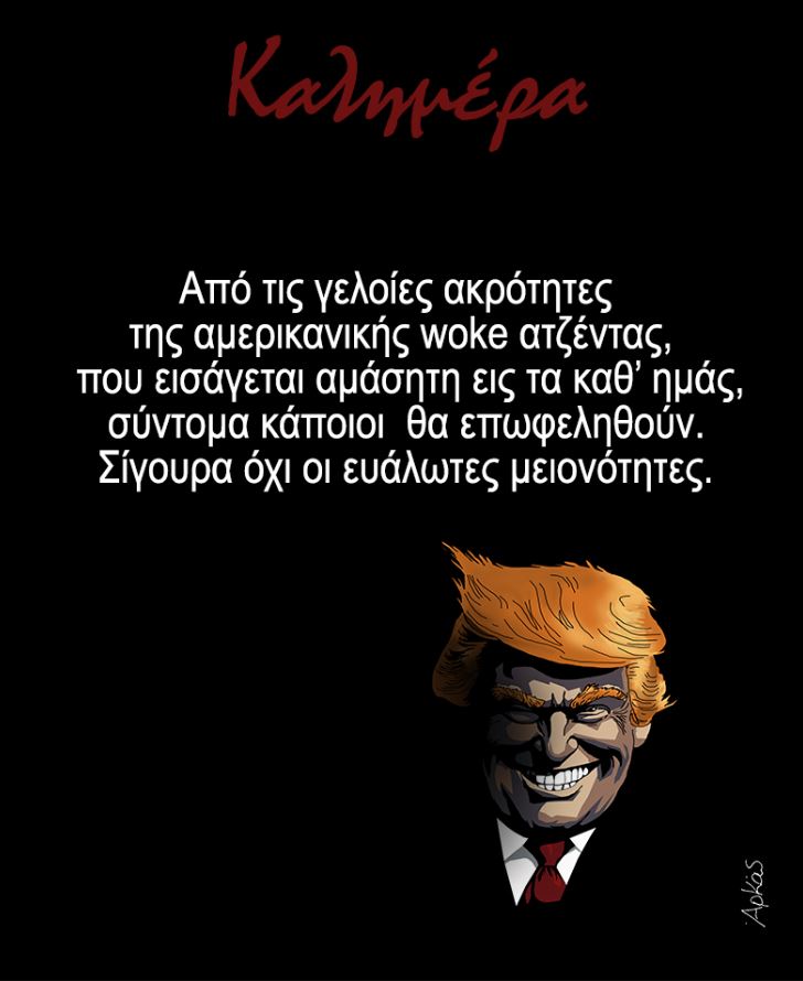 Ενα τέτοιο ενδεχόμενο δεν αντιμετωπίζεται καθόλου θετικά από τον Αρκά και αυτό προκύπτει μεταξύ άλλων και από το κατάμαυρο φόντο του σκίτσου του στο οποίο διακρίνεται μόνο το σαρδόνιο βλέμμα και χαμόγελο του Ντόναλντ Τραμπ.