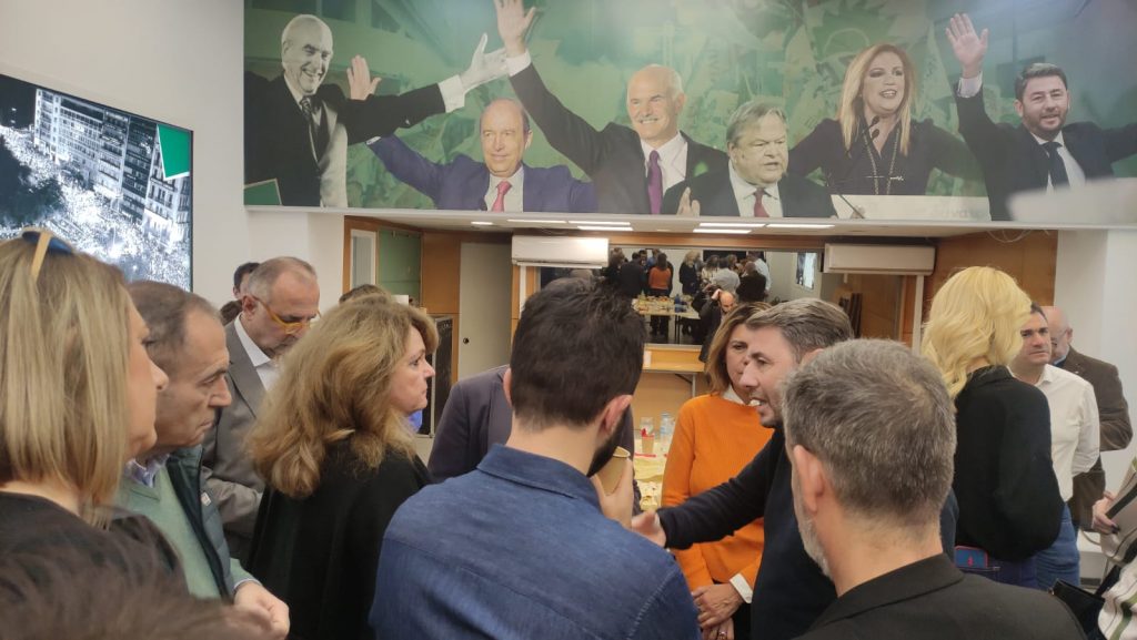 Παρόντες, ο απελθών εκπρόσωπος Θανάσης Γλαβίνας, που αναβαθμίστηκε με τη θέση που πήρε στο συντονιστικό πολιτικό κέντρο, αλλά και οι νεοσσοί στα του Τύπου Κώστας Τσουκαλάς και Όλγα Μαρκογιαννάκη. Μεταξύ «τυρού και αχλαδίου» κι ενώ οι διαπιστευμένοι συντάκτες προσπαθούσαν να στριμώξουν τα νέα μέλη της επικοινωνιακής ομάδας για μία είδηση, εμφανίστηκε στην αίθουσα Νίκος Ανδρουλάκης.