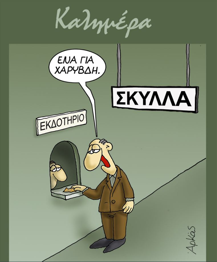 Ο διάσημος καλλιτέχνης με το σκίτσο του, μας μεταφέρει σε ένα εκδοτήριο εισιτηρίων όπου προβάλλεται κάποιο θεάμα. Σε μια ταμπέλα που βρίσκεται στο χώρο, πάνω από το εκδοτήριο των εισιτηρίων, αναγράφεται η λέξη ΣΚΥΛΛΑ. Ο πρωταγωνιστής του σκίτσου, στέκεται εμπρός στο εκδοτήριο και ζητά από τον υπάλληλο ένα εισιτήριο για τη Χάρυβδη.