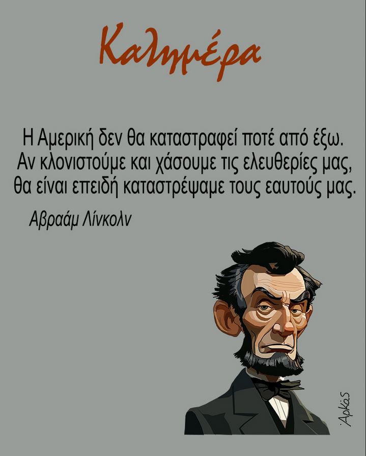 Ο Αρκάς, με αφορμή τα εκλογικά αποτελέσματα που δείχνουν ότι οι Αμερικανοί προκρίνουν τον Ντόναλντ Τραμπ για Πρόεδρο της Αμερικής, σκιτσάρει τον πρώην Πρόεδρο των Ηνωμένων Πολιτειών Αβραάμ Λίνκολν και την αναφορά του στην Αμερική.