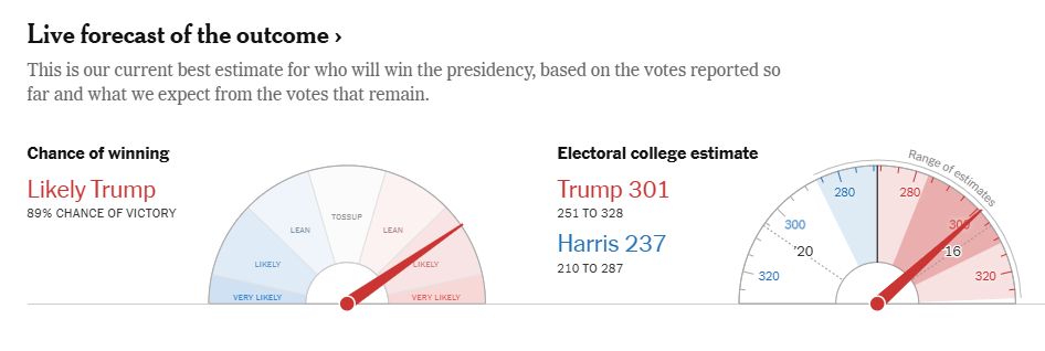 Ειδικότερα, στις 6:00 ώρα Ελλάδας σύμφωνα με το μοντέλο των NYT ο ρεπουμπλικανός υποψήφιος φέρεται να έχει πιθανότητα εκλογής με ποσοστό 87% και προβλέπεται να πάρει τους 301 (από τους 538) εκλέκτορες και να εκλεγεί στον Λευκό Οίκο ενώ η Κάμαλα Χάρις φαίνεται να μένει στους 237.