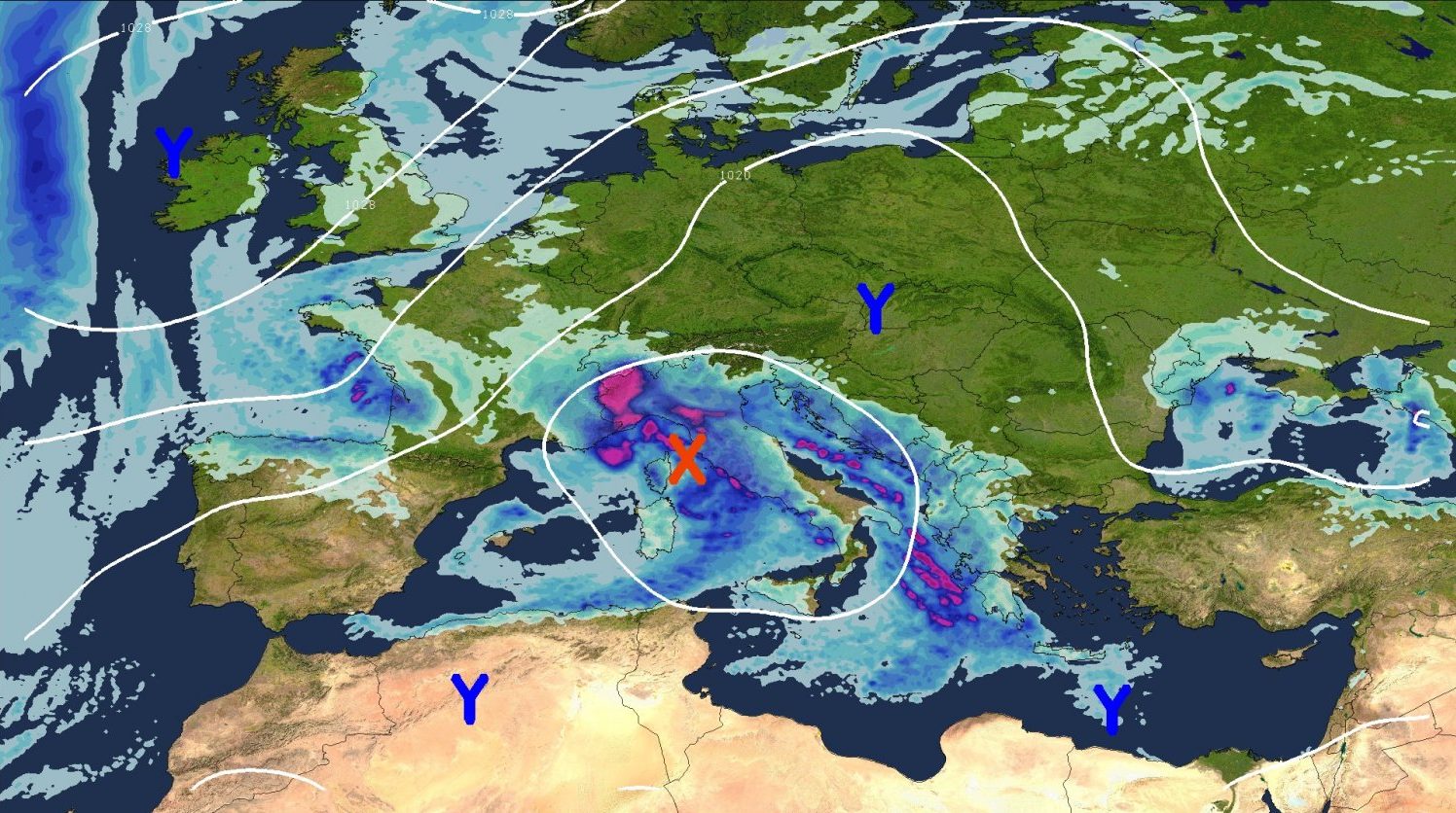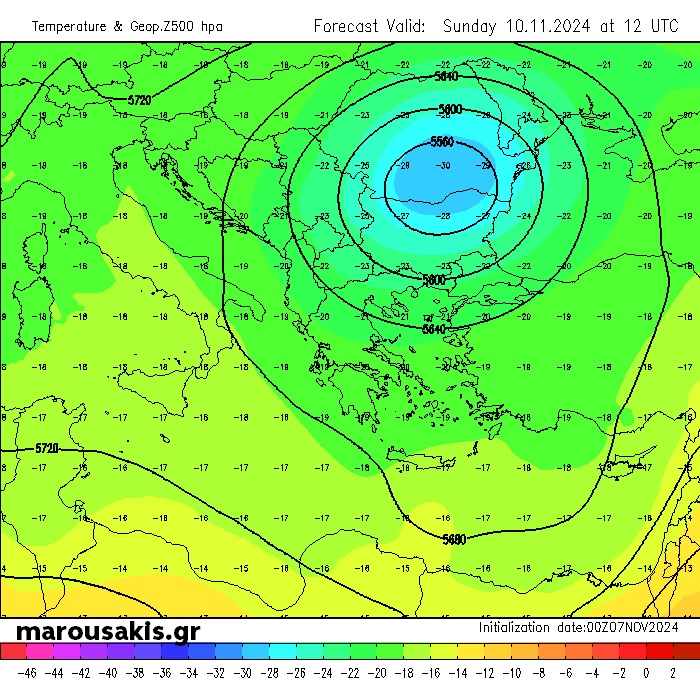 Μια διαταραχή λοιπόν σε υψηλότερα στρώματα της ατμόσφαιρας όπως απεικονίζεται στον πρώτο μας χάρτη με τις μπλε αποχρώσεις, θα αποτελέσει την αρχή της καιρικής αλλαγής αλλάζοντας τη ροή της κυκλοφορίας και ανοίγοντας την πόρτα μετά από πολλές ημέρες για να μας έρθουν οι κακοκαιρίες πλέον από τα δυτικά, με άλλα λόγια να ευθυγραμμιστεί η ατμοσφαιρική κυκλοφορία με την εποχή που διανύουμε.